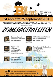 Eindelijk is het weer zo ver, Bar Boerderie gooit op 24 april zijn staldeuren open voor een spetterende after work. Kom dansen, zingen en klinken op een zalige zomer!Elk jaar in mei wordt bij Flegado, één van de zorgcampussen van NEKTARI vzw, de feesttent opgezet: het startsein van weer een nieuwe ‘Bar Boerderie’-zomer.De zorgtak van NEKTARI zet in op de talenten van volwassenen met een beperking en biedt individuele-, woon- en dagondersteuning aan (meer info op www.nektari.be).De inmiddels bekende zomerbar ‘Bar Boerderie’ is een inclusieproject waarbij door de samenwerking tussen cliënten, medewerkers van Flegado en buurtbewoners, een gezellige ontmoetingsplek wordt gecreëerd voor iédereen - met of zonder eventuele beperking. Dit project vertrekt vanuit onze visie: de levenskwaliteit van onze cliënten verhogen en hun zelfbeeld een boost geven. Met veel enthousiasme zetten ze hun capaciteiten en talenten maximaal in om uit te blinken achter de bar, in de keuken, als ober of als DJ.In onze zomerbar kan je niet alleen genieten van een lekker drankje en een hapje, maar je kan er ook onze boerderijdieren ontdekken, tot rust komen in onze moestuintjes of kennismaken met onze cliënten en hun leefomgeving.Het is de ideale plaats om te verpozen met vrienden en familie of als tussenstop voor wandelaars en fietsers.Je vindt ‘Bar Boerderie’ terug op de boerderij van Flegado (achter de sporthal), Achterhoefweg 37 te Puurs-Sint-Amands.