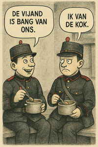 In het dagelijkse leven van een soldaat is humor onmisbaar. Humor zorgt voor wat afleiding tijdens het saaie kazerneleven of tijdens de moeilijke momenten aan het front.Ook in propaganda wordt er dankbaar gebruik gemaakt van humor. Je kan er de vijand mee op de korrel nemen of je eigen hachelijke situatie relativeren. In onze expo vind je soldatenhumor van diverse soorten en uit verschillende tijdvakken. Passeer langs beeldfragmenten, postkaarten en propagandaposters of luister naar geluidsfragmenten en ontdek of een soldatengrap van honderd jaar oud vandaag nog wel grappig is. Allemaal met een knipoog naar het militaire leven.