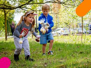 Je kunt niet alleen eitjes komen zoeken. Er zijn ook toffe buitenactiviteiten, springkastelen en meespeeltheater Jeuk! komt de boel op stelten zetten.